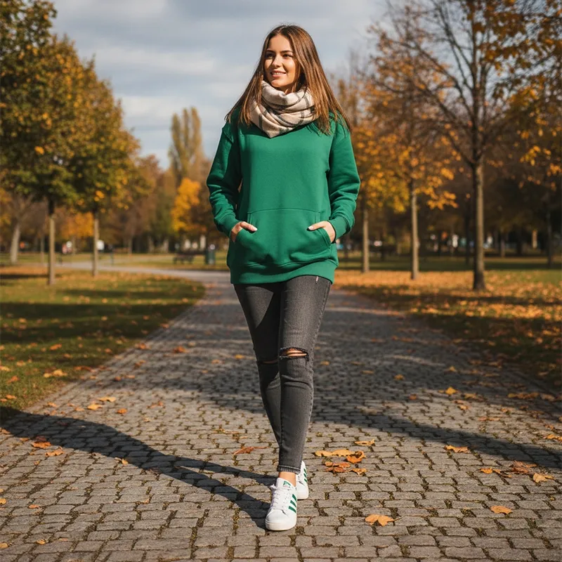 Denna fleecefodrade huvtröja kombinerar värme och mode, vilket gör den till ett måste under kallare månader. Den mjuka insidan behåller värmen och håller dig varm utan att kännas klumpig. Den mångsidiga designen passar bra till både jeans och sportiga tights. Huven ger extra skydd mot vinden, medan den avslappnade passformen ger komfort vid aktiviteter. Oavsett om du handlar eller njuter av en ledig helg är denna huvtröja ditt självklara val. Den ser till att du är både snygg och bekväm under kalla årstider.
